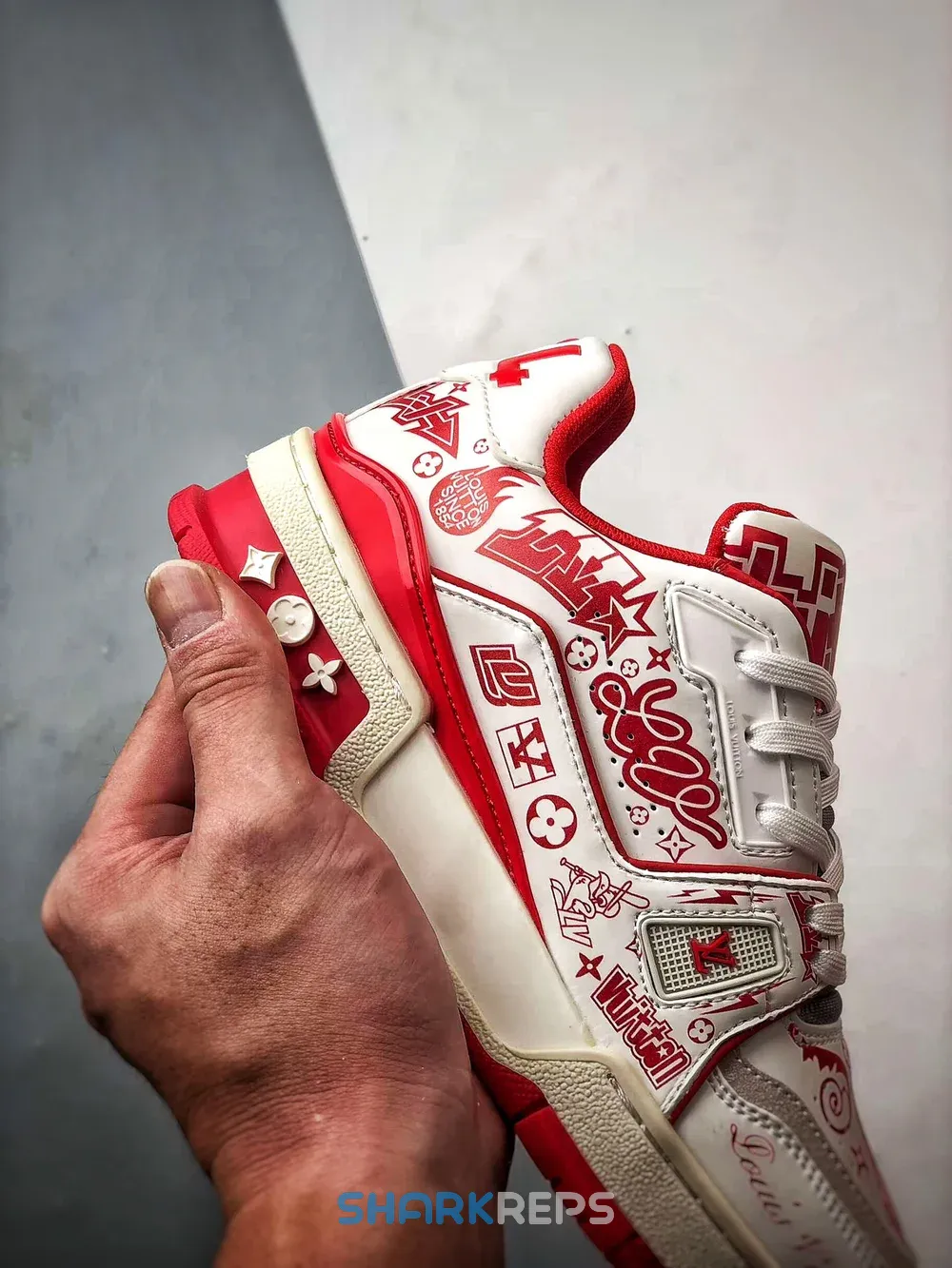 This bold iteration of the LV Trainer sneaker comes in smooth calf leather printed with graffiti-like signatures and slogans inspired by the ready-to-wear collection. The back of the sneaker displays the #54 logo, referring to 1854, the year Louis Vuitton was founded. The bicolor, technical outsole is decorated with Monogram Flowers.